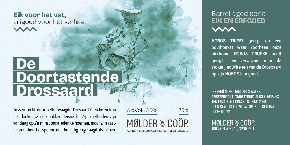 HOBOS TRIPEL gerijpt op een bourbonvat waar voorheen onze bierbrand HOBOS DRUPKE heeft gerijpt. Een verwijzing naar de stokerij-activiteiten van de drossaard op zijn HOBOS landgoed. 10%